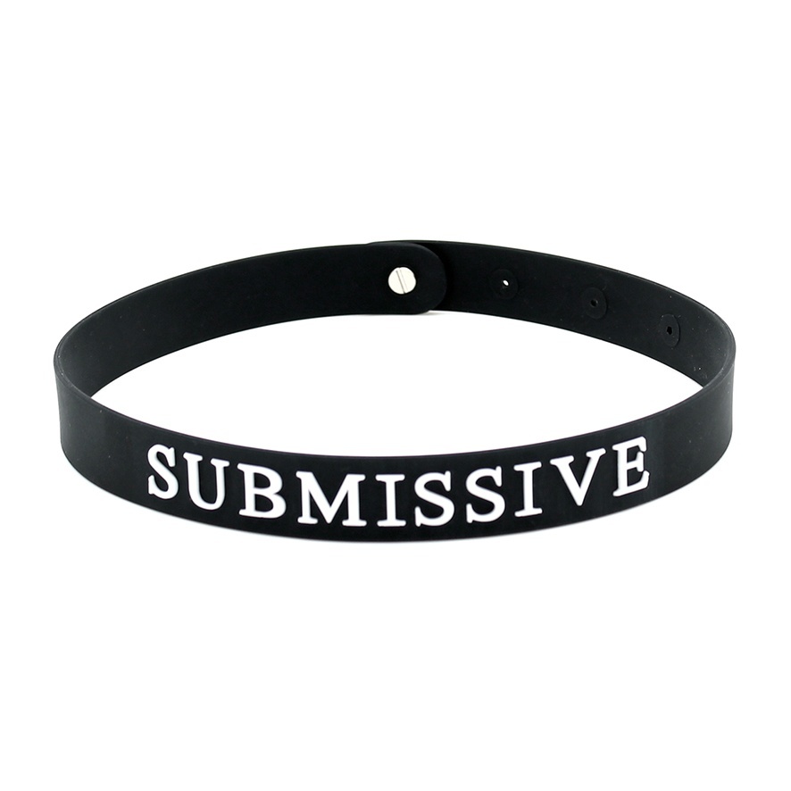 The word SUBMISSIVE is written on the front of the collar in white letters.