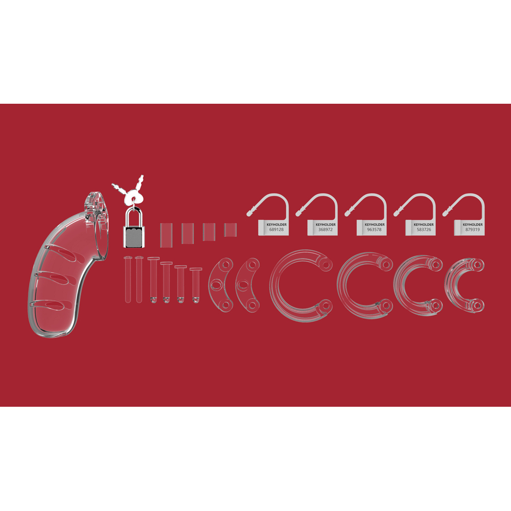Man Cage Chastity Cages are manufactured from high-grade polycarbonate, a very light, durable and hypoallergenic material. The cage consists of three parts that fit perfectly together. The two guidance pins connect the top parts and the oval taper pin connects the rings with the cage. A variety of rings in different sizes and distance pieces will allow you to create the perfect size! The rings have a comfortable fit and are absolutely safe.