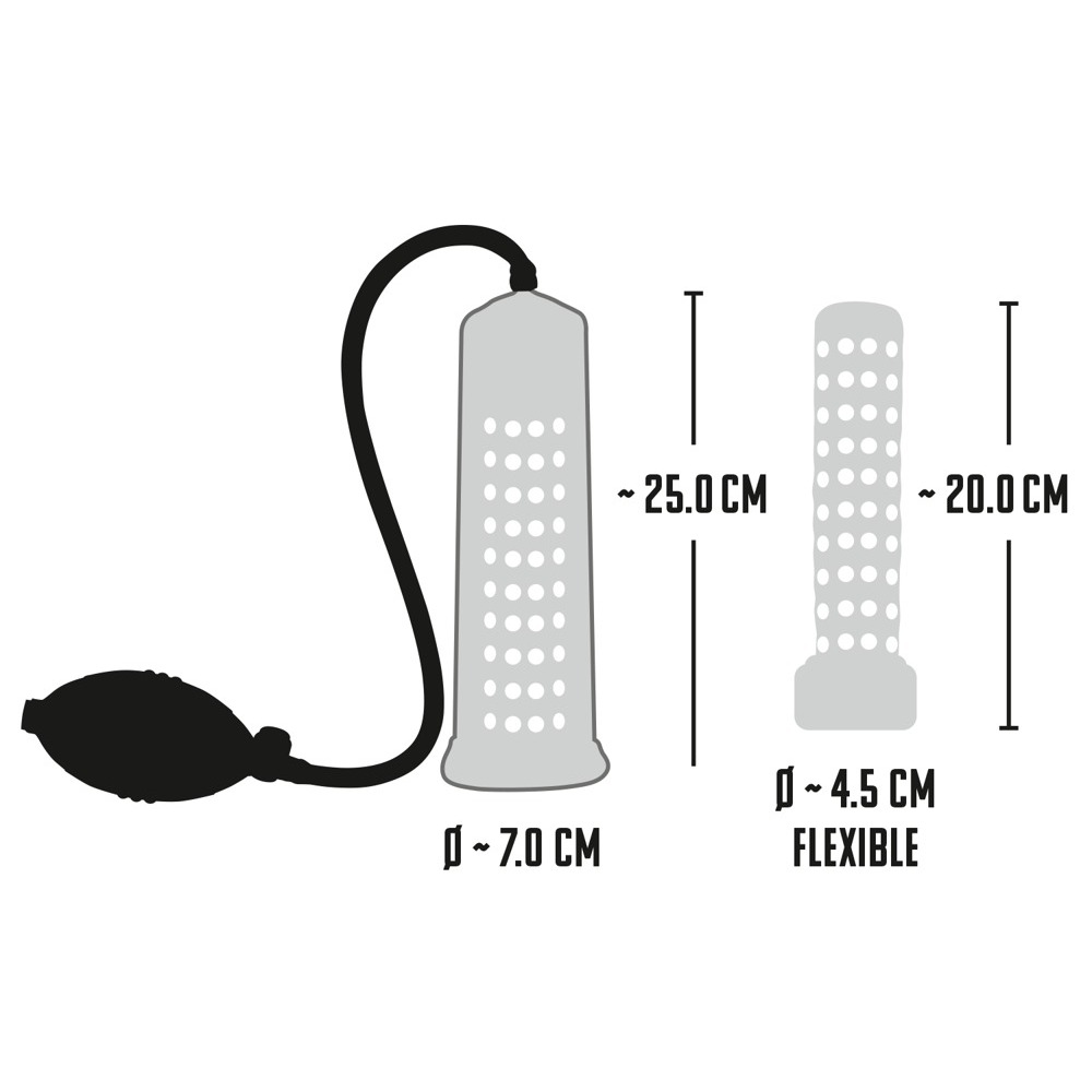 Enjoy awesome pleasure as you train your penis to top form with this transparent penis pump with studded inner sleeve and handy pump ball.