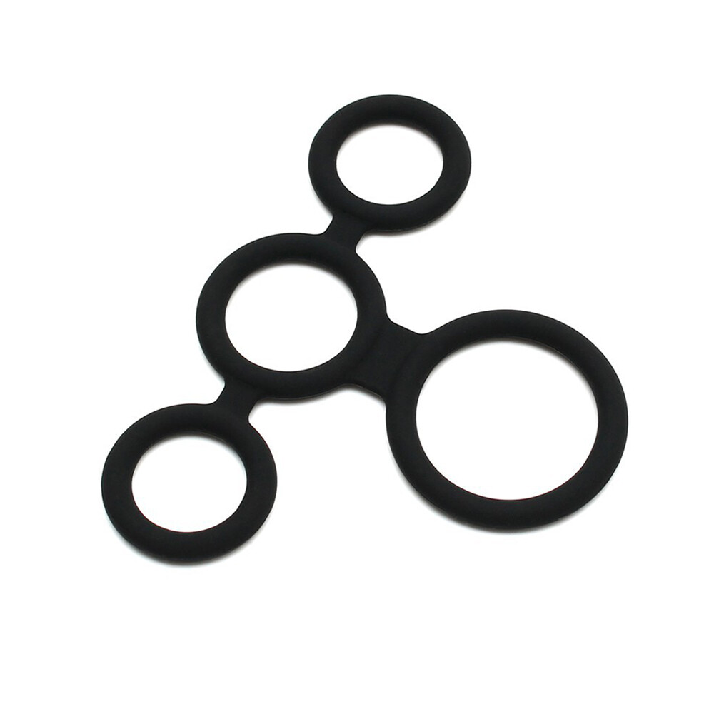 This cockring has four rings that are attached to each other, one with a diameter of 4 cm, one with a diameter of 2.5 cm and two with a diameter of 2 cm. The largest ring 4 cm needs to be worn around the scrotum. The second ring 2.5 cm should be worn around the shaft. The two smaller rings both 2 cm should be placed around one testicle each, splitting the balls.